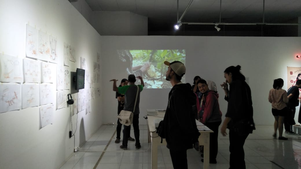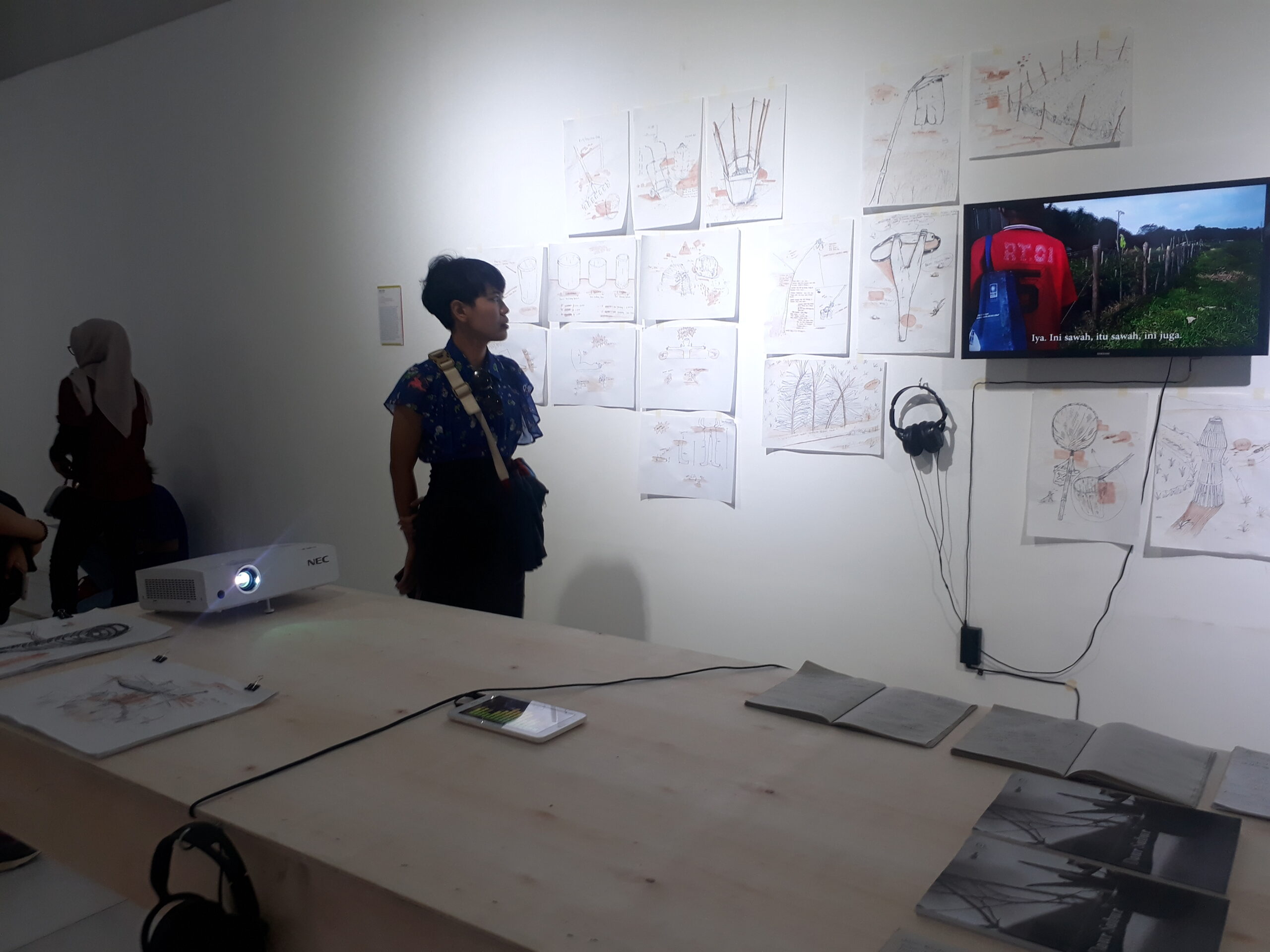 Selain itu, instalasi karya Daur Subur dalam pameran ini dilengkapi dengan sebuah meja kerja yang di atasnya bertumpuk puluhan skestsa, catatan-catatan riset, sebuah proyektor yang menghadirkan playlist karya video warga tengah memanfaatkan hasil dari satu pohon kelapa. Seperti, pengambilan buah kelapa dengan memberdayakan beruk, cara mengupas kelapa, hingga pemanfaatan daun kelapa sebagai bahan bakar untuk memasak.
