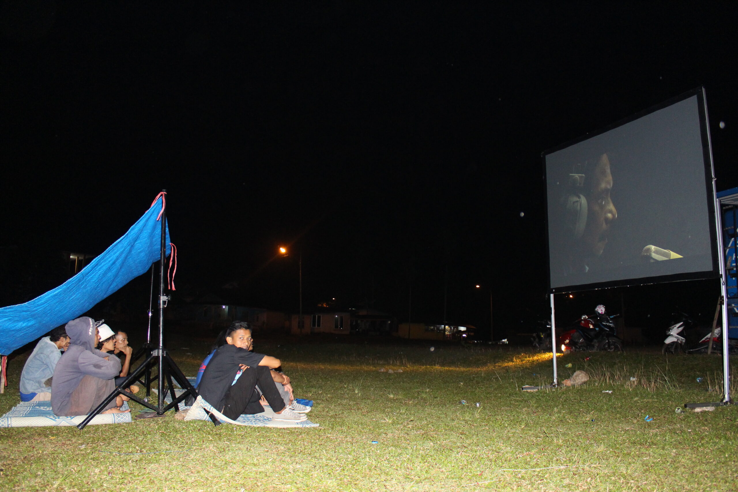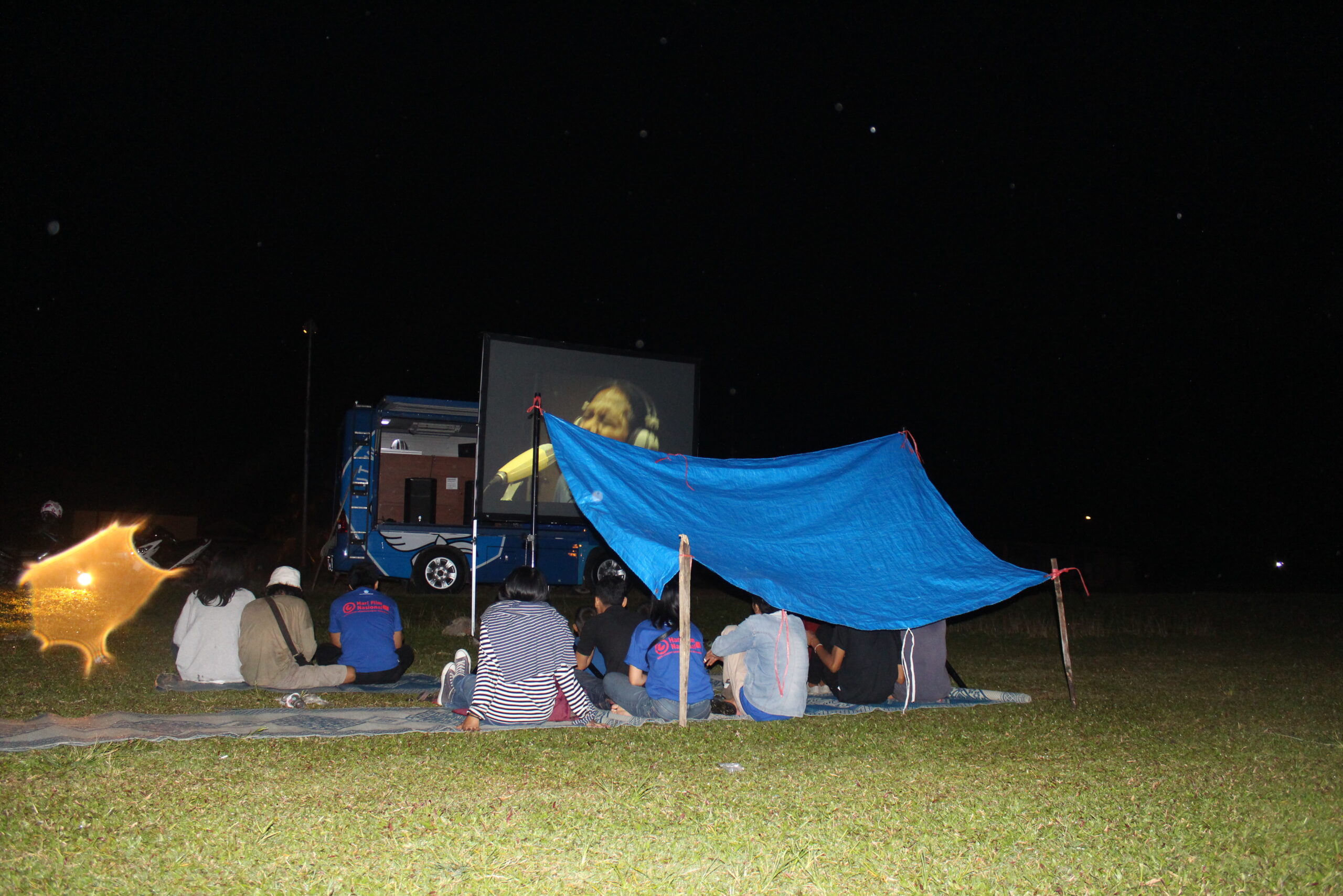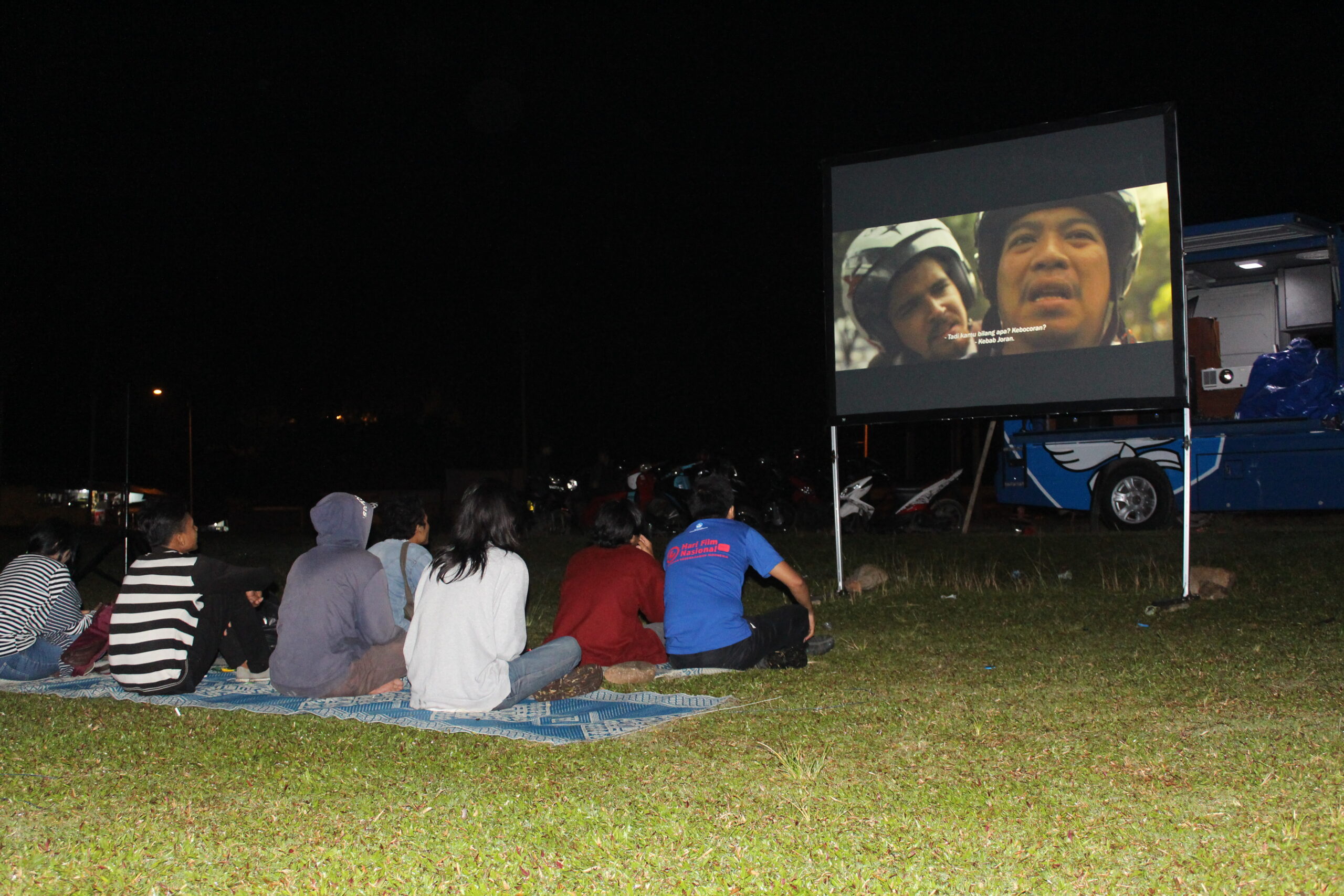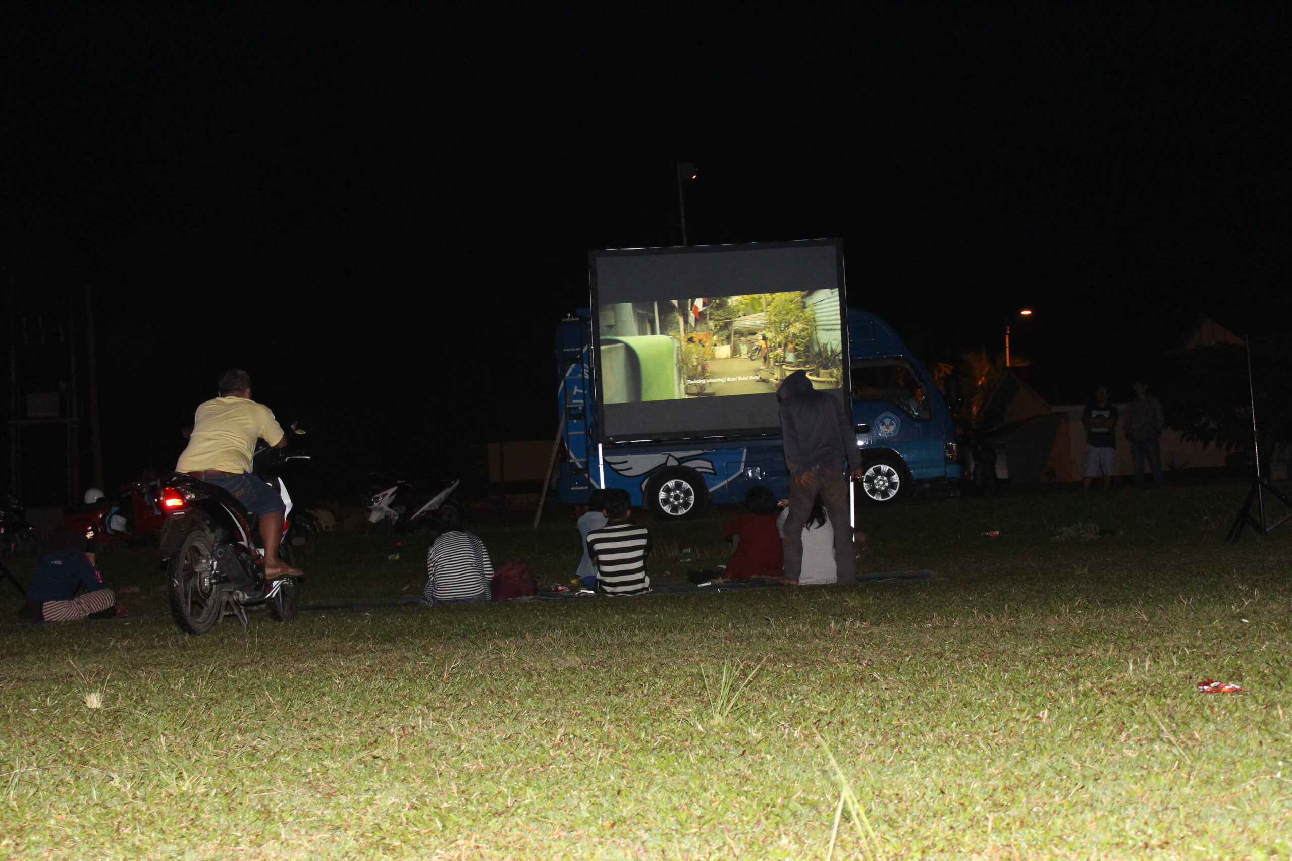 Malam itu 25 Maret 2017, tiba-tiba hujan mengguyur lapangan pacuan kuda tempat penayangan dilakukan. Malam itu kita menayangkan program film pendek “Mencari Indonesia”. Program film ini sebenarnya telah disiapkan oleh panitia Hari Film Nasional dari pusat, untuk dibagikan pada kelompok yang ingin merayakan Hari Film Nasional. Kita ikut megambil pilihan film itu, sembari melihat bagaimana ‘pusat’, atau panitia yang ditunjuk— merepresentasikan film nasional hari ini dengan tajuk “Mencari Indonesia”. Warga yang sudah mendekati mobil Bioskop Keliling pun satu-satu berpencar mencari tempat berteduh, ketika hujan semakin deras. Pedagang, roti bakar, sate, dan kacang pun kebingunan mencari tempat berteduh. Satu-satu warga muncul dan ikut berteduh di bawah terpal yang tidak seberapa besar, beberapa juga berusaha menikmati film dari kejauhan sembari berteduh. Di bawah hujan itu penayangan tetap dilakukan, untung saja mobil Bioskop Keliling yang kita berdayakan untuk kegiatan ini memiliki kualitas audio dan gambar yang bagus. Meskipun tidak senyaman menonton dari dekat, warga pun tetap menikmati.