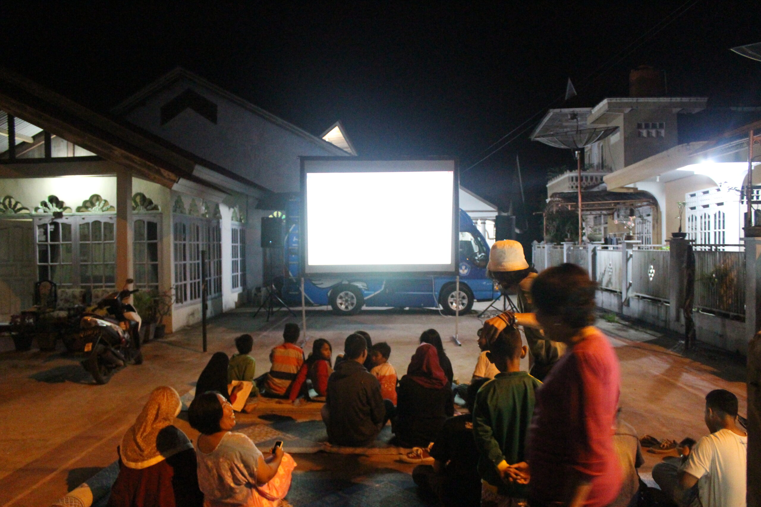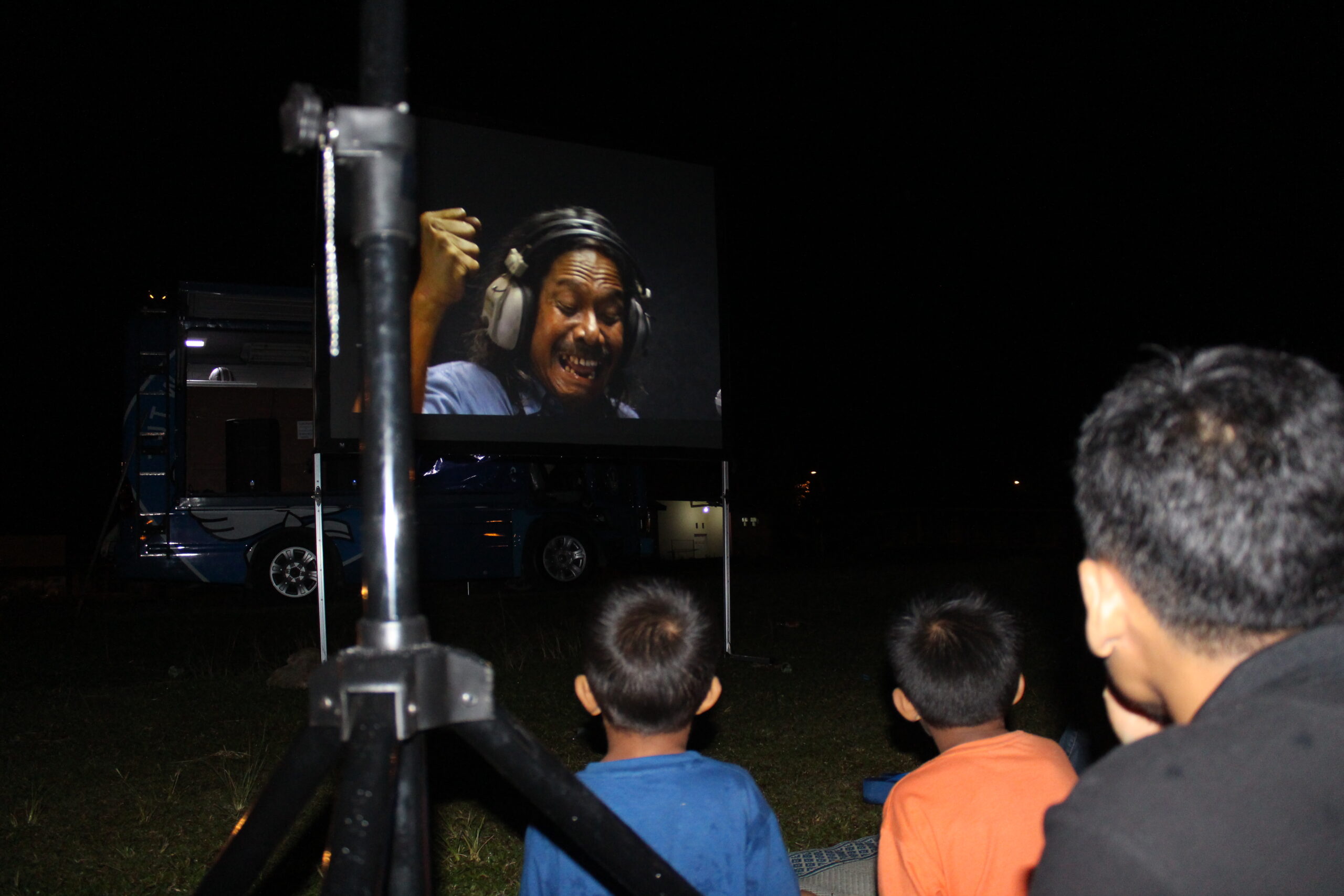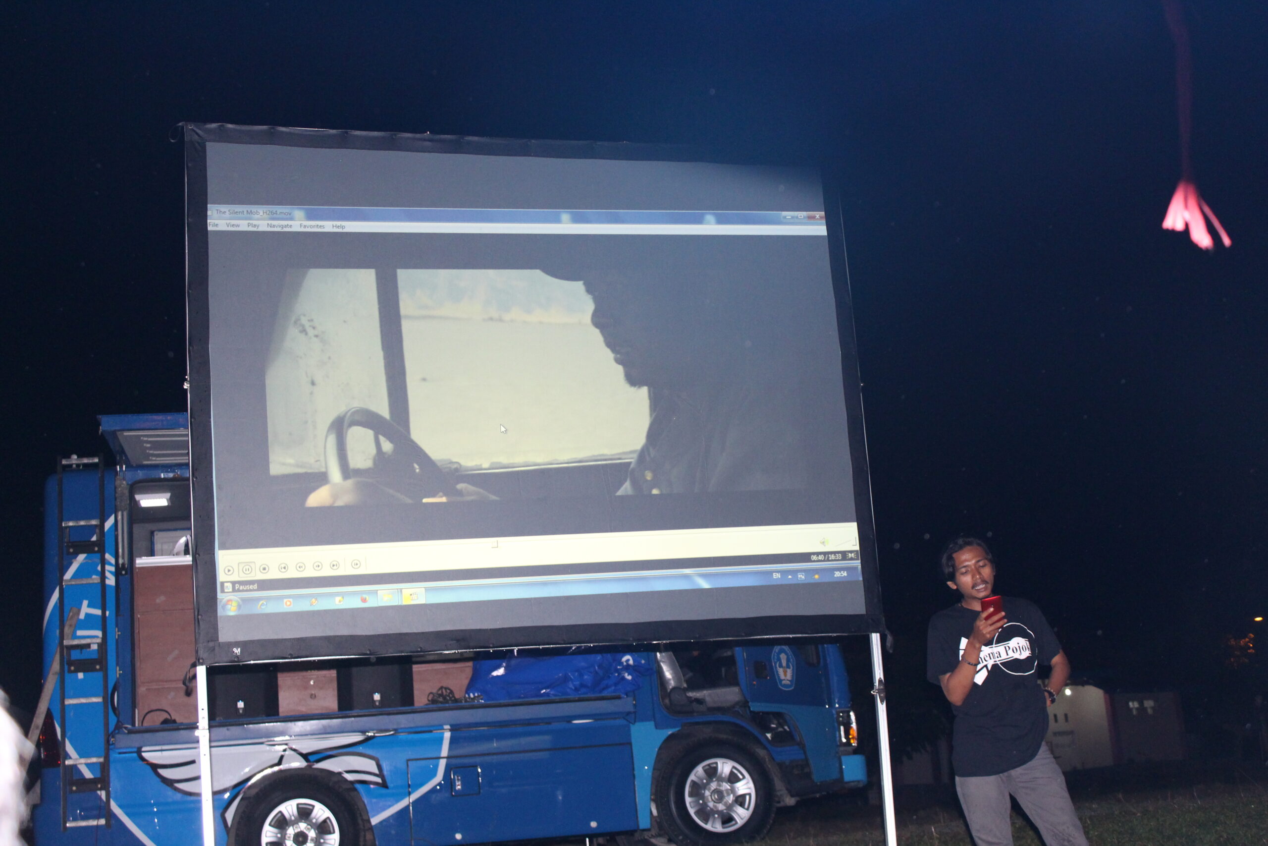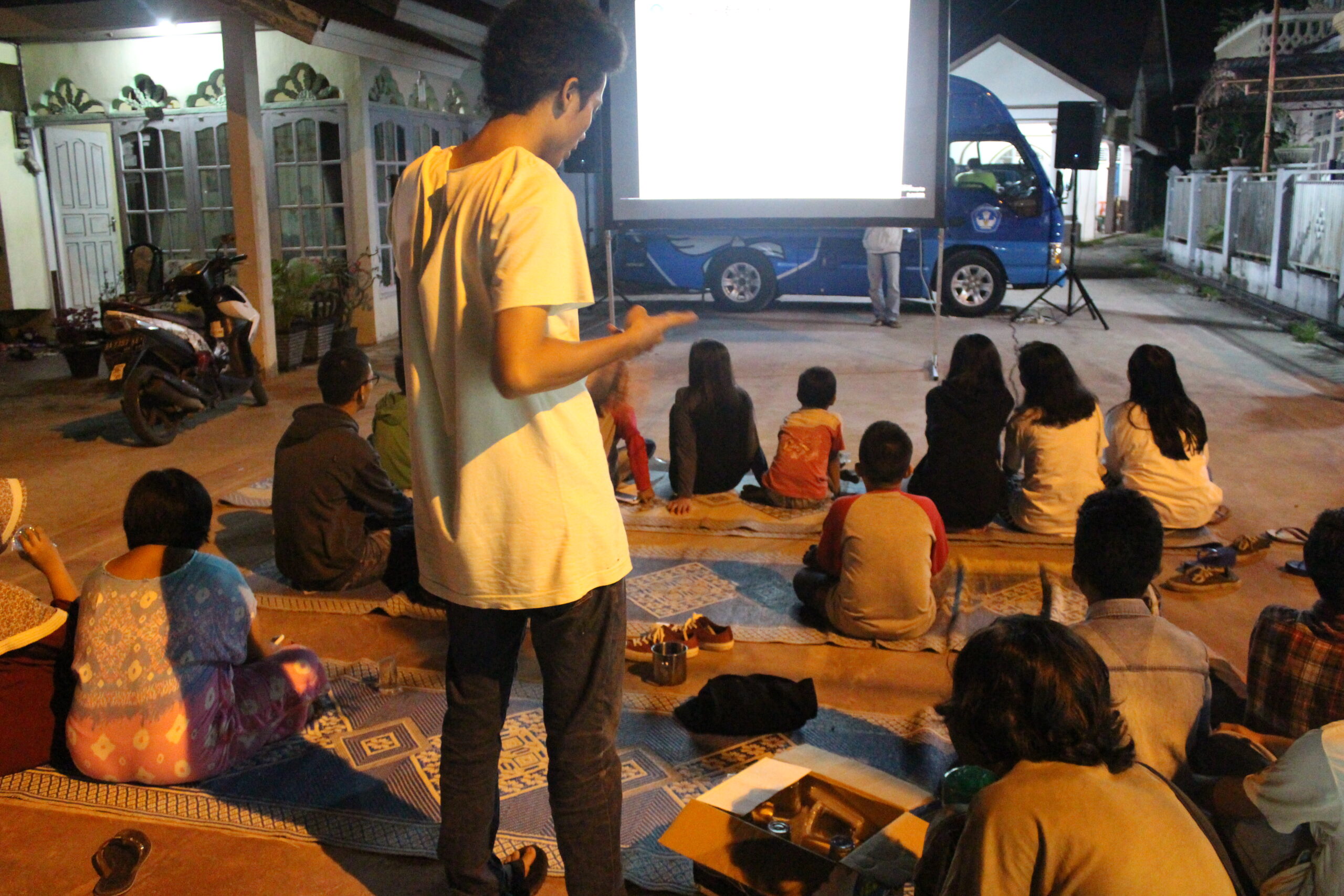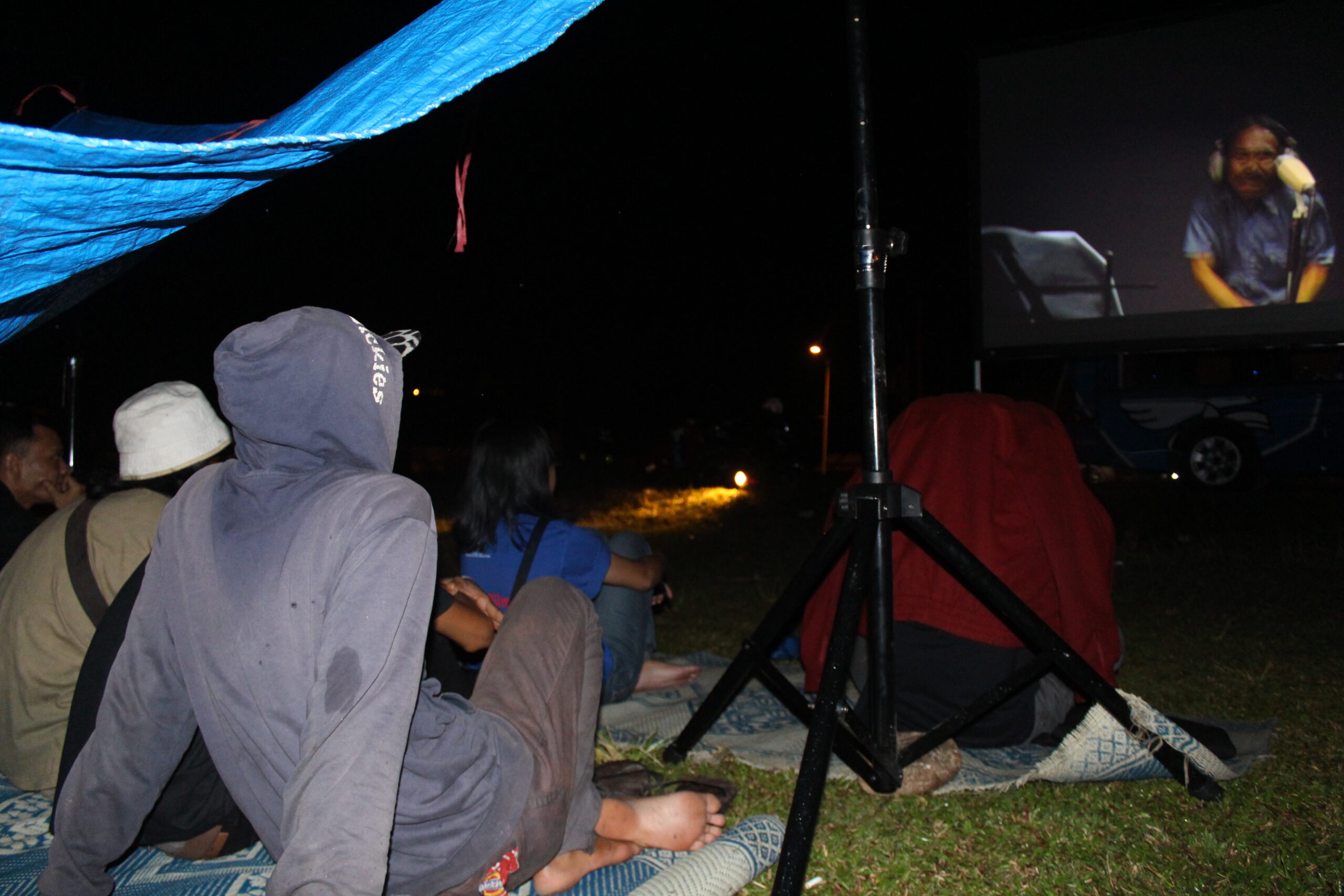 Malam itu 25 Maret 2017, tiba-tiba hujan mengguyur lapangan pacuan kuda tempat penayangan dilakukan. Malam itu kita menayangkan program film pendek “Mencari Indonesia”. Program film ini sebenarnya telah disiapkan oleh panitia Hari Film Nasional dari pusat, untuk dibagikan pada kelompok yang ingin merayakan Hari Film Nasional. Kita ikut megambil pilihan film itu, sembari melihat bagaimana ‘pusat’, atau panitia yang ditunjuk— merepresentasikan film nasional hari ini dengan tajuk “Mencari Indonesia”. Warga yang sudah mendekati mobil Bioskop Keliling pun satu-satu berpencar mencari tempat berteduh, ketika hujan semakin deras. Pedagang, roti bakar, sate, dan kacang pun kebingunan mencari tempat berteduh. Satu-satu warga muncul dan ikut berteduh di bawah terpal yang tidak seberapa besar, beberapa juga berusaha menikmati film dari kejauhan sembari berteduh. Di bawah hujan itu penayangan tetap dilakukan, untung saja mobil Bioskop Keliling yang kita berdayakan untuk kegiatan ini memiliki kualitas audio dan gambar yang bagus. Meskipun tidak senyaman menonton dari dekat, warga pun tetap menikmati.
