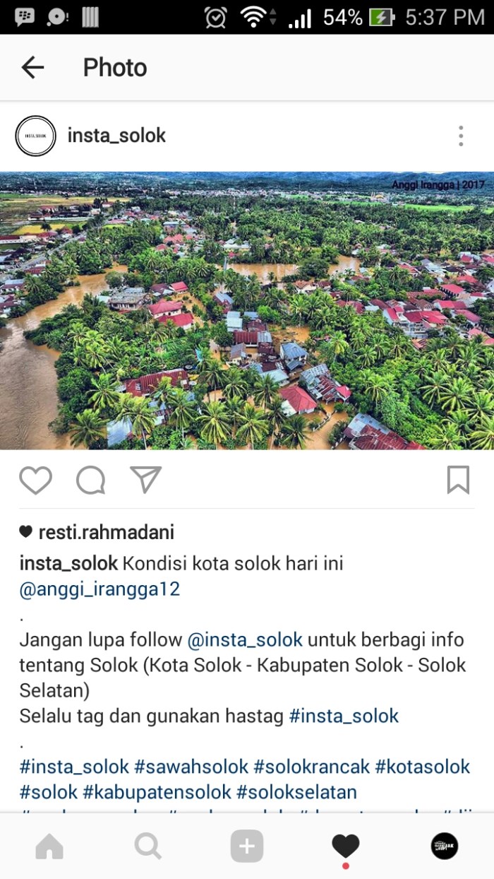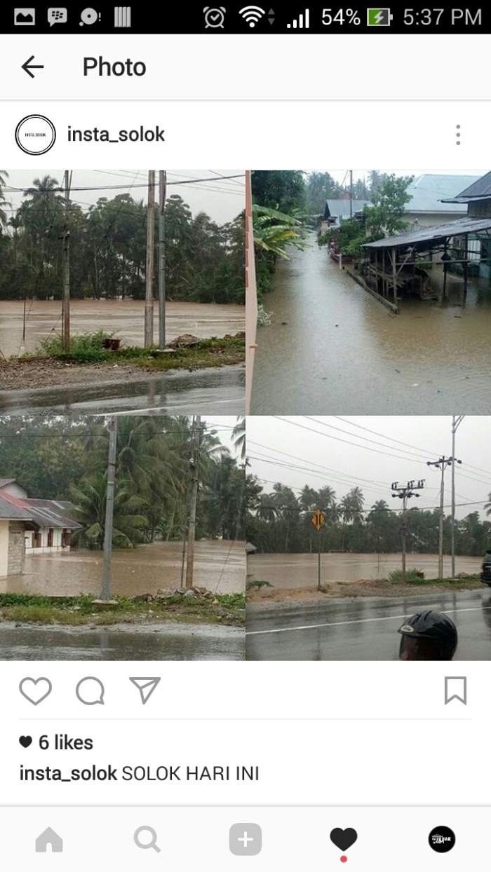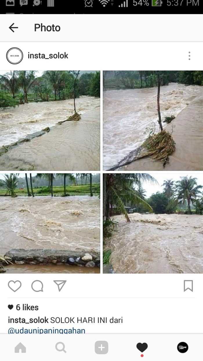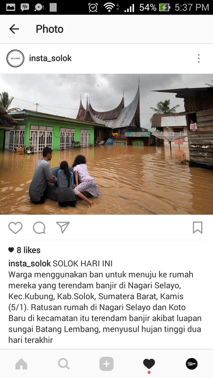 Tahun lalu, banjir itu terjadi di bulan Februari, daerah yang sama selalu ditutupi banjir. Kali ini terjadi di Januari, dua minggu sebelumnya sering hujan di beberapa titik, tidak ada korban meninggal. Setau saya ini yang paling besar. Maaf, maksud saya, selalu meningkat setiap tahunnya. Tapi tungggu dulu, ini bisa saja tidak se-menyedihkan yang dibayangkan, atau ada hal lain yang lebih menyedihkan. Sewaktu kecil rasanya tidak ada tempat untuk bajir di Solok. Kini di hulu, alam tak sanggup lagi mencegah bajir, merayakan kekonyolan kita. Kita yang di bawah tidak tahu kekonyolan apa yang terjadi di hulu, apakah memang salah dari hulu?