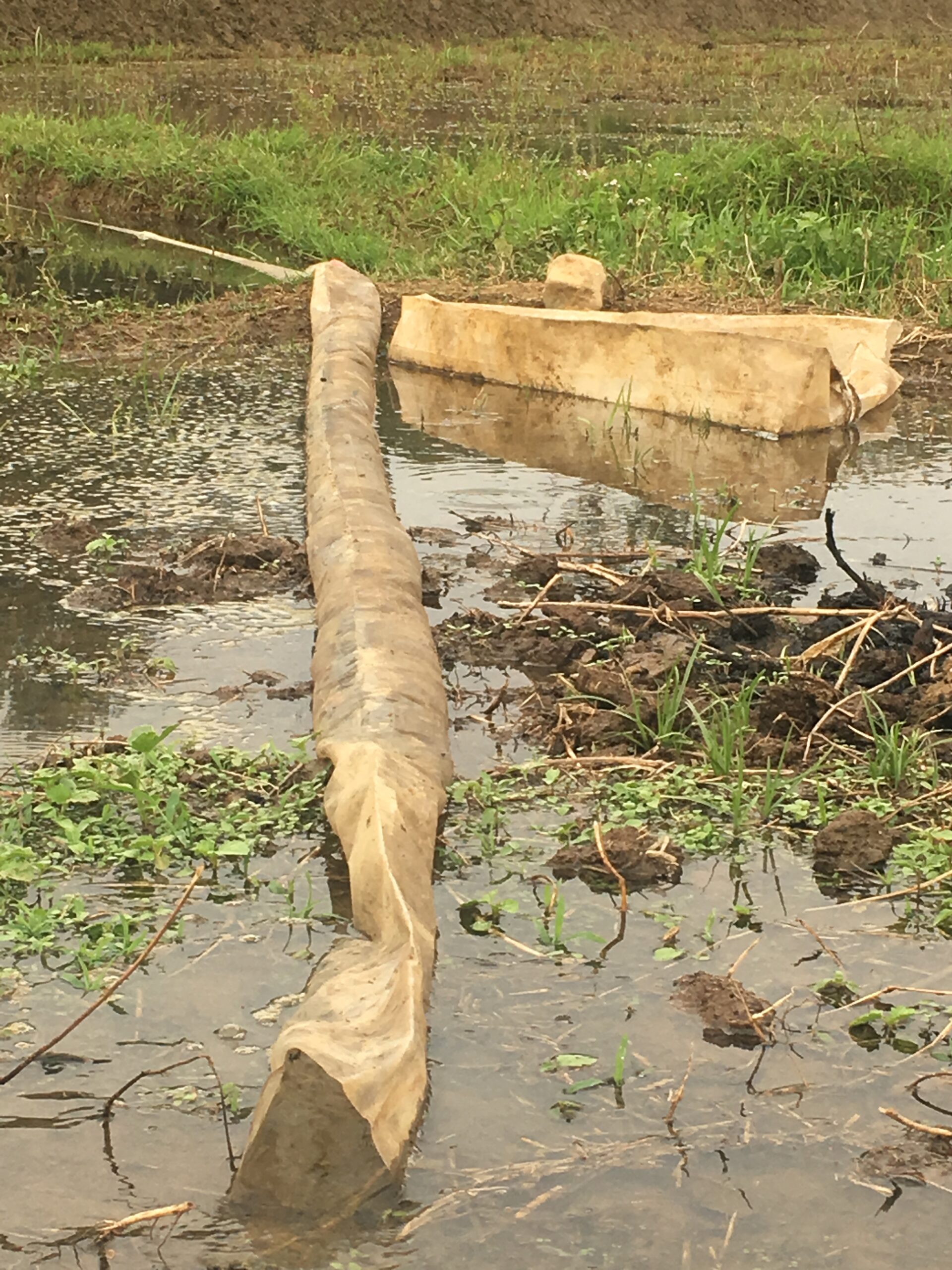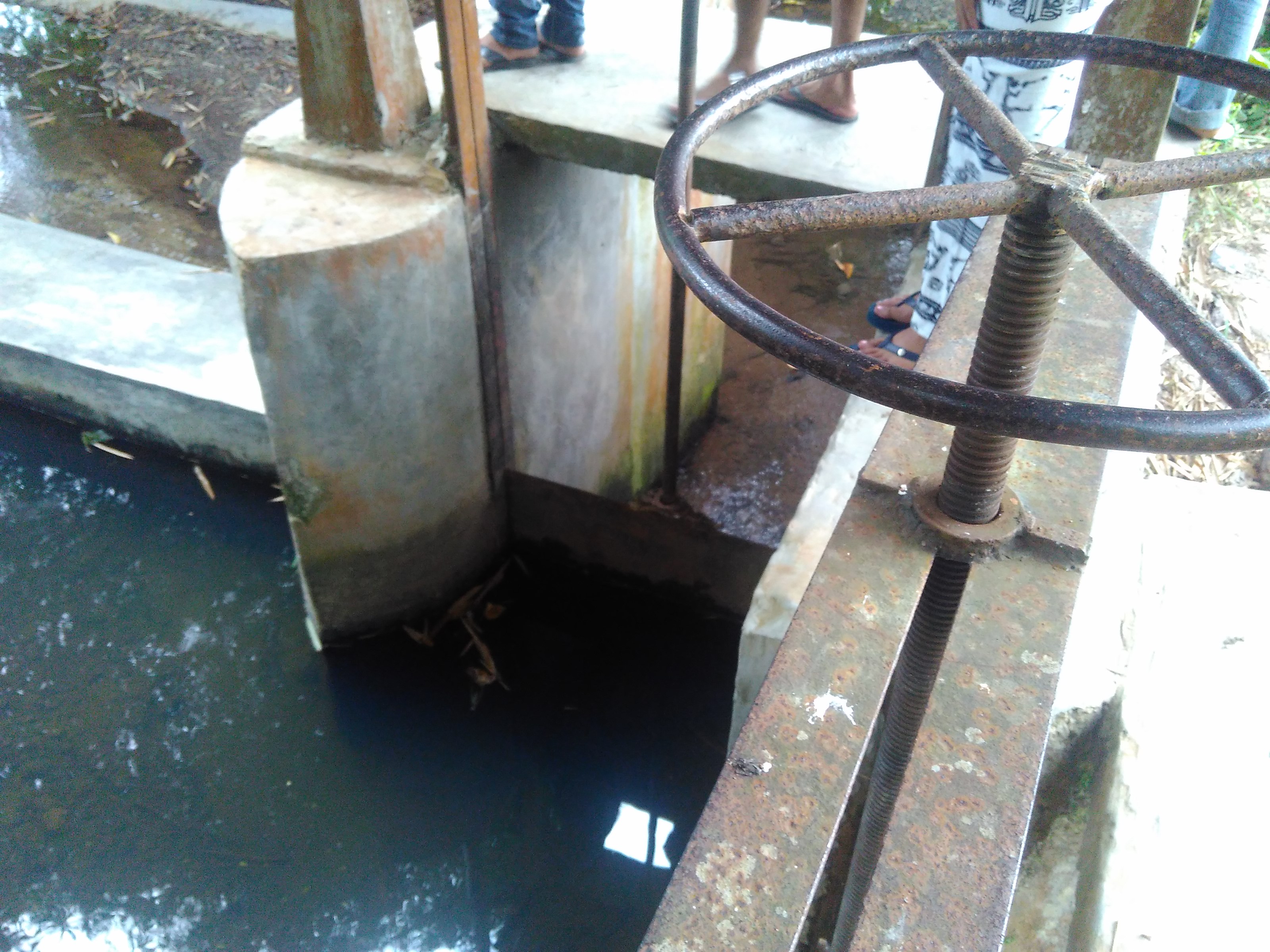 Berbeda dengan lokasi observasi yang aku datangi sebelumnya, di sini tidak kutemui adanya kincir air. Sistem pengairan di sini terlihat sudah lebih modern, yaitu menggunakan irigasi. Terbukti dengan adanya sungai di lokasi itu yang dijadikan waduk irigasi dengan pintu air yang mengalirkan air ke sawah-sawah, terletak di tengah-tengah areal persawahan yang kemudian membelah kawasan persawahan itu menjadi dua bagian. Tapi irigasi itu seperti kurang terawat, debit air sungainya juga sedikit karena mengalami pendangkalan. Entah kalau musim penghujan tiba, mungkin akan terlihat berbeda. Meski demikian, sawah-sawah yang ada sekitar pengairan itu tak tampak seperti kekurangan air.