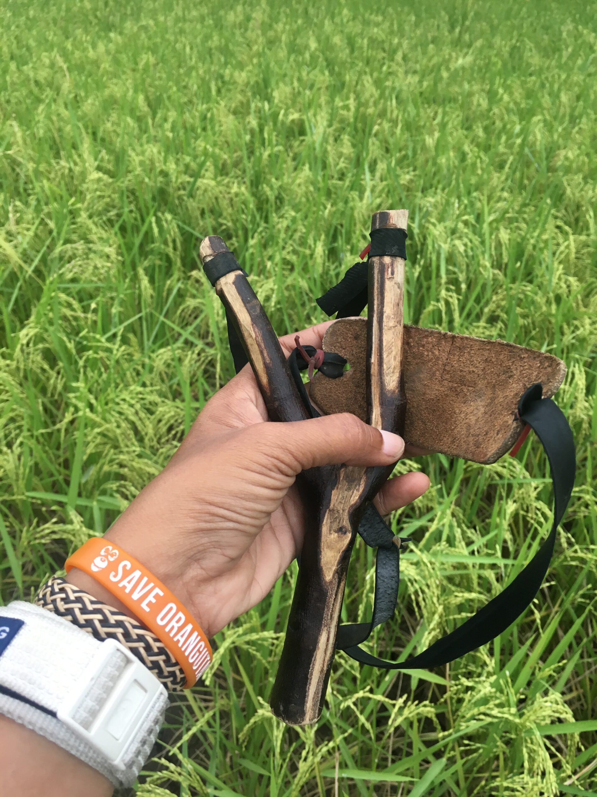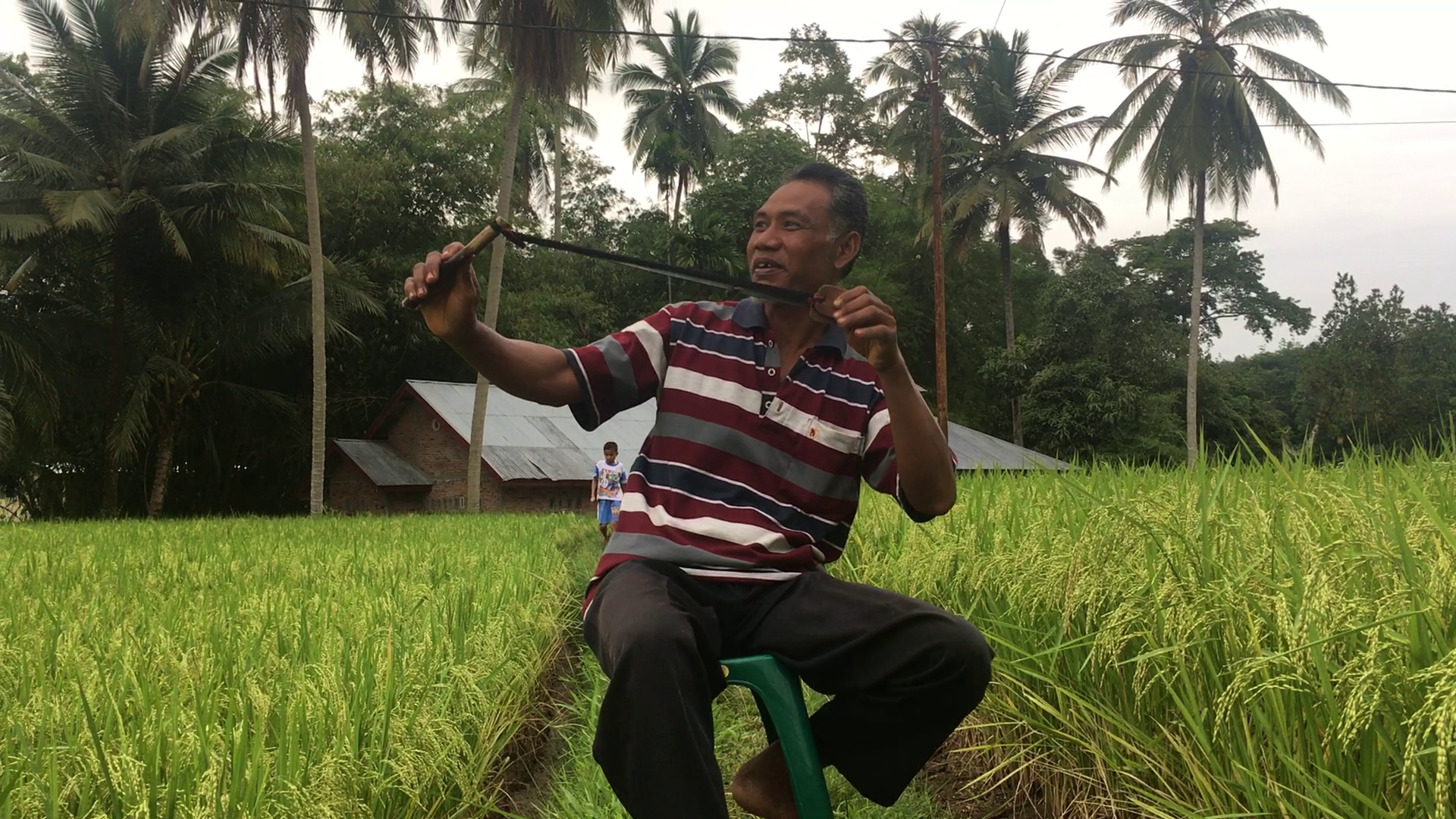 Aku dan Ade mencoba menggali informasi terkait apa yang sedang dilakukan Mak Etek dengan ketapel yang dipegangnya itu, lewat percakapan ringan sambil ikutan santai di antara rimbunnya tanaman padi yang sudah meninggi, dan mulai memunculkan bulir-bulirnya. Mak Etek juga tidak keberatan, ketika aku mengambil beberapa foto dan merekam percakapan kami itu. Malah beliau tampak senang dan bangga, ketika aku memintanya untuk mempraktekkan bagaimana cara kerja ketapel yang sedari tadi dipegangnya.