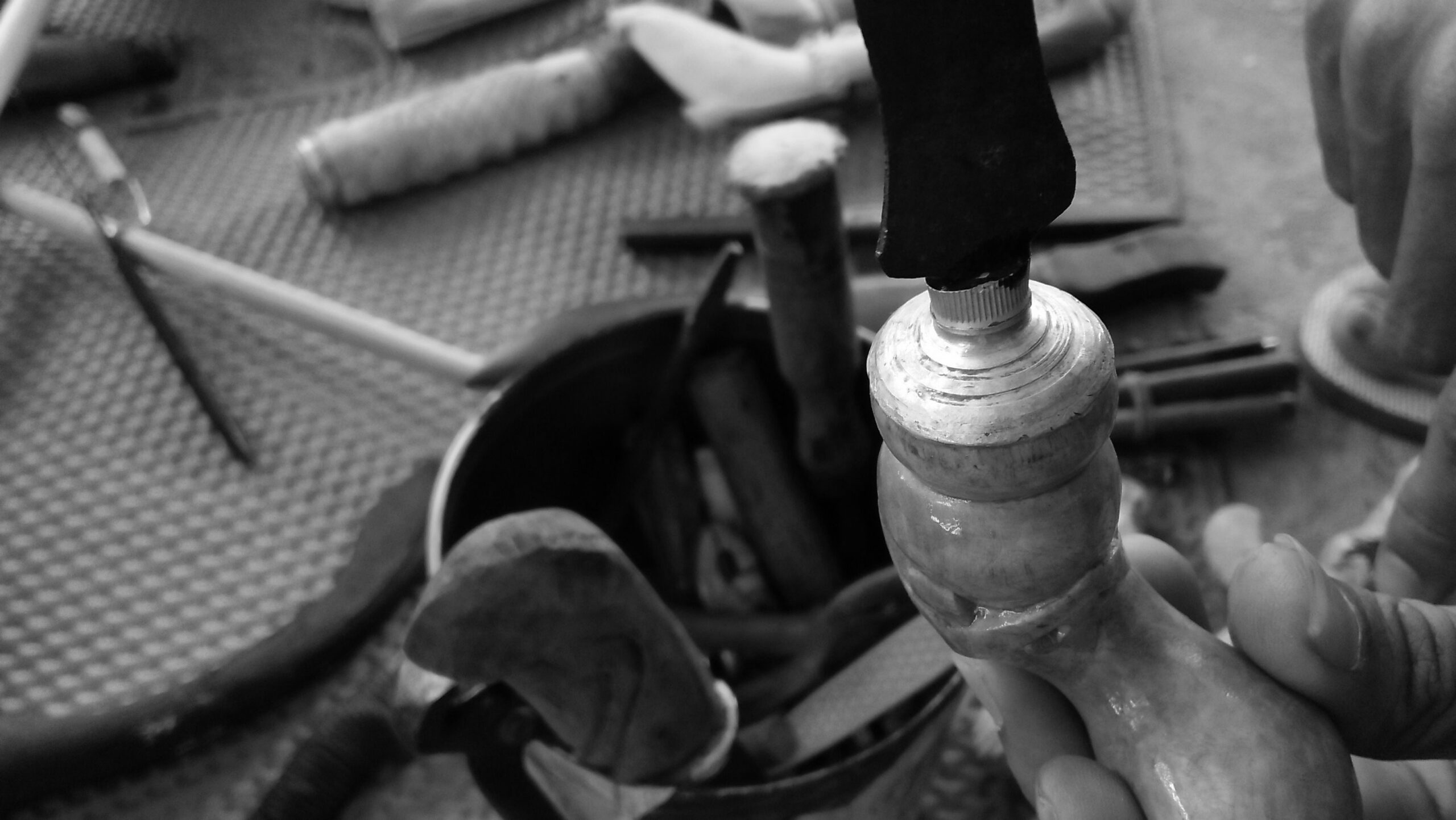 Setelah berbincang bincang seputar alat transportasi alternatif yang mempermudah pertanian ketika zaman beliau muda dulu. Ada beberapa narasi menarik terkait perkembangan pola yang sama pada hari ini. Sesuatu yang unik terlihat pada sebuah gagang dan mata pisau juga keris-keris buatan Buya. Alat itu sungguh membuat saya bersama teman-teman tertawa dan merasa tertipu oleh pisau ukiran buya. Ternyata alat itu terbuat dari bahan seadanya yang mudah ditemui sekitar kita yaitu dengan menggunakan ujung pasta odol yang telah dipotong, lalu disematkan antara gagang dan pisau. Kata buya, alat itu dinamakan saluik/bawa yaitu penyambung dari gagang ke pisau. Selain menggunakan pasta odol bekas beliau juga memakai paralon dan bekas tempat lipstick untuk dijadikan saluik/bawa.