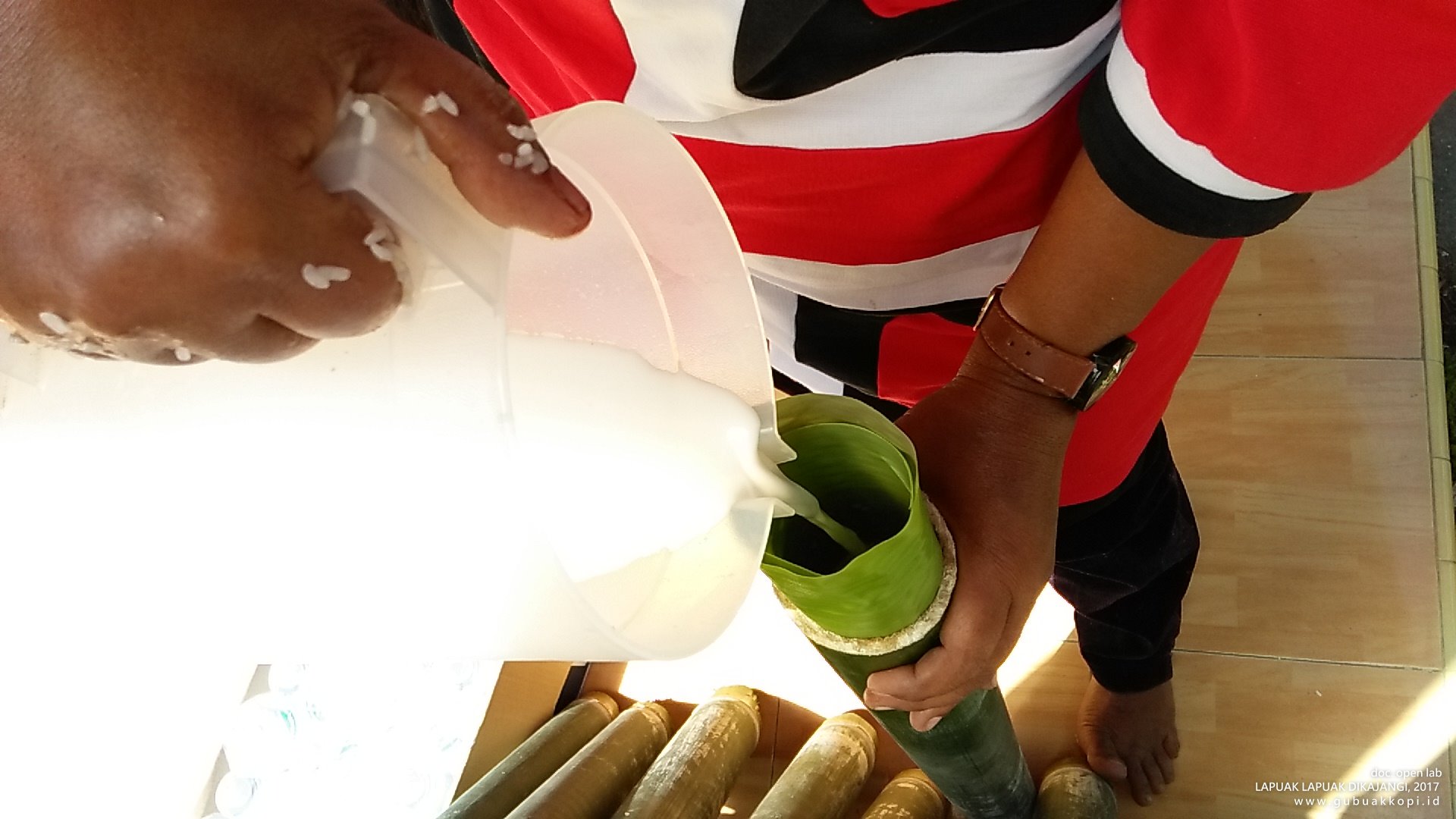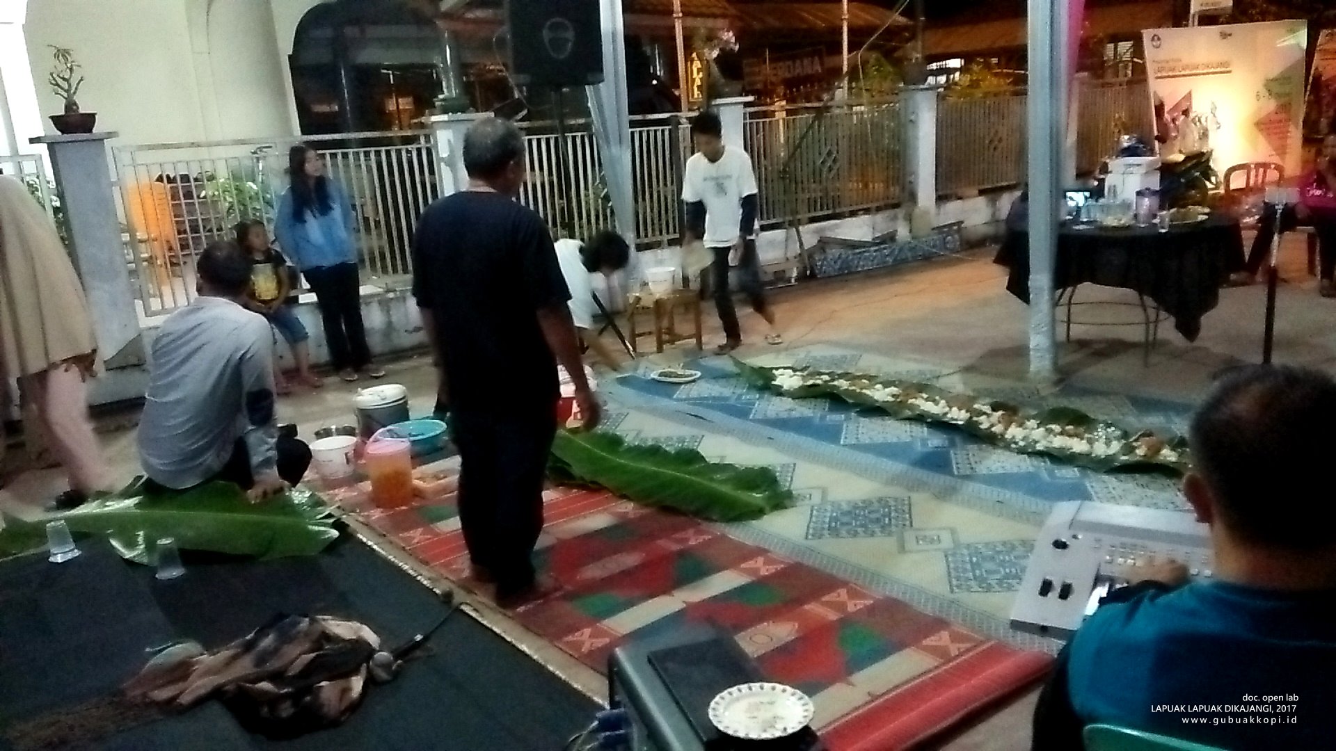 Aksi ‘makan baleak’ (makan bersama) di malam penutupan open lab: LAPUAK LAPUAK DIKAJANGI, 6-8 Oktober 2017, di Galeri Gubuak Kopi.
