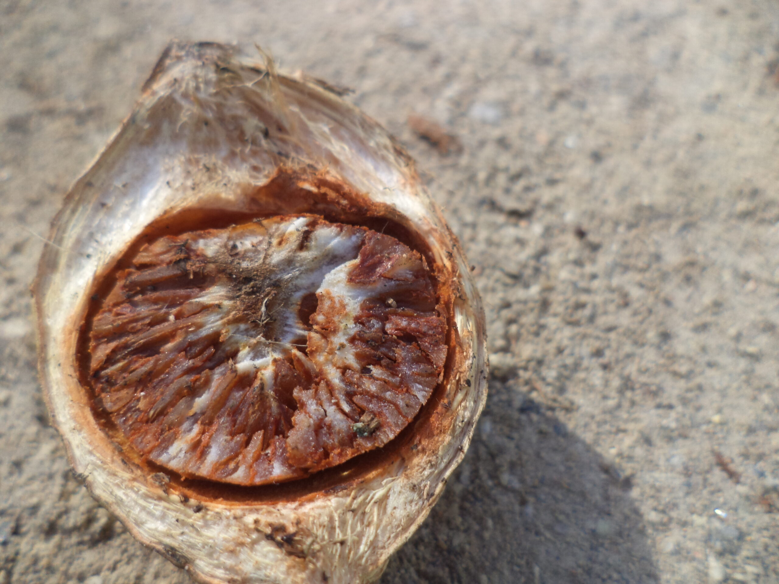 Cukup lama bercakap-cakap dengan keluarga tersebut, kami pun berpamitan untuk melanjutkan observasi ke lokasi lain, sembari kawan-kawan lain juga masih memotret beberapa jenis bunga yang ada di pekarangan rumah Ami. Baru saja akan beranjak dari rumah keluarga Buk Ami, seorang warga di depan rumahnya terlihat sedang menjamur “Pinang Belah” di pekarangan. Rumah tersebut ditinggali oleh keluarga Buk Ida. Sebuah rumah sederhana, dengan halaman tak terlalu luas, di sanalah pinang belah tersebut dijemur dengan jumlah yang tak begitu banyak. Kebetulan Buk Ida terlihat sedang bersantai di depan rumahnya, kami pun menghampiri beliau sekaligus mendokumentasikan jemuran pinang.