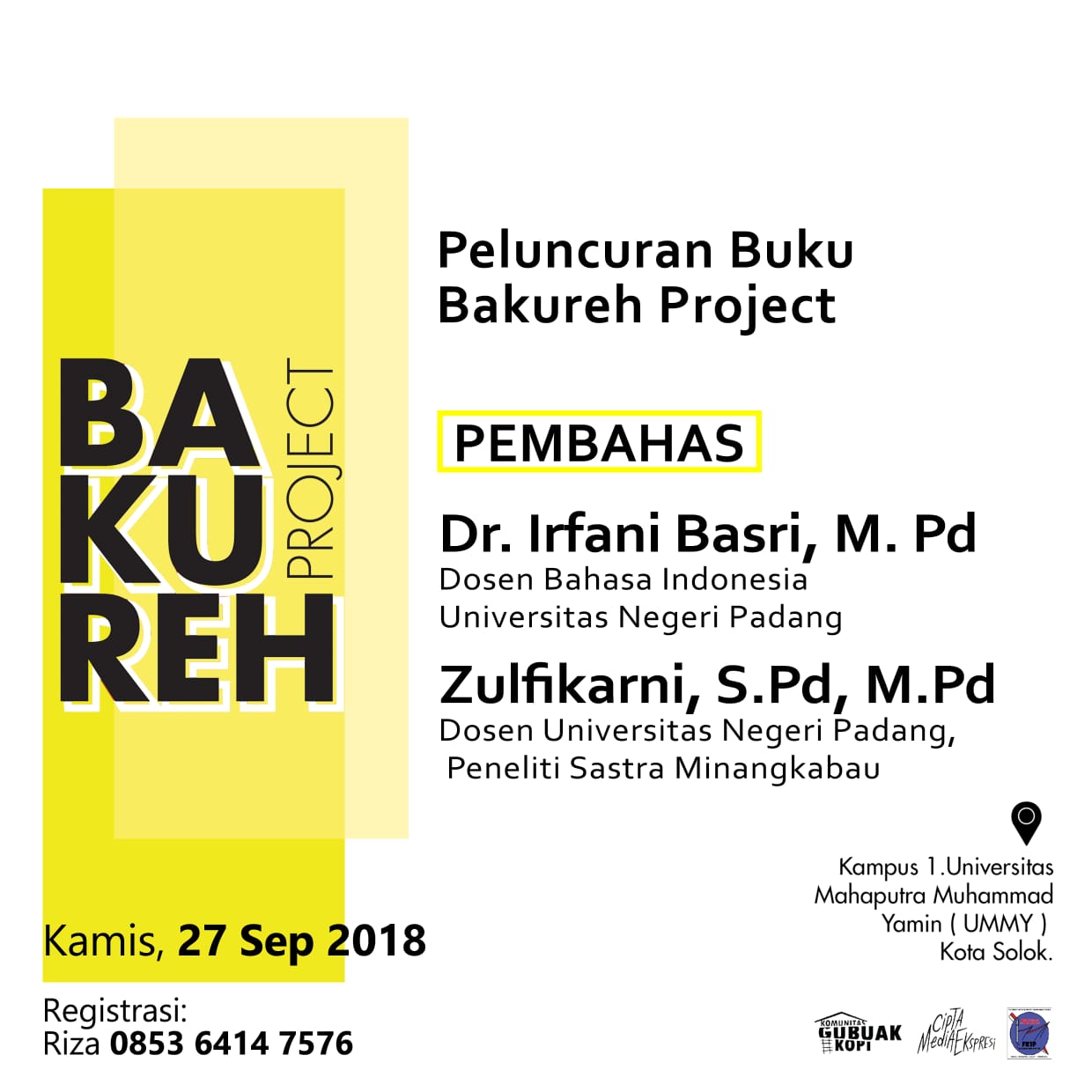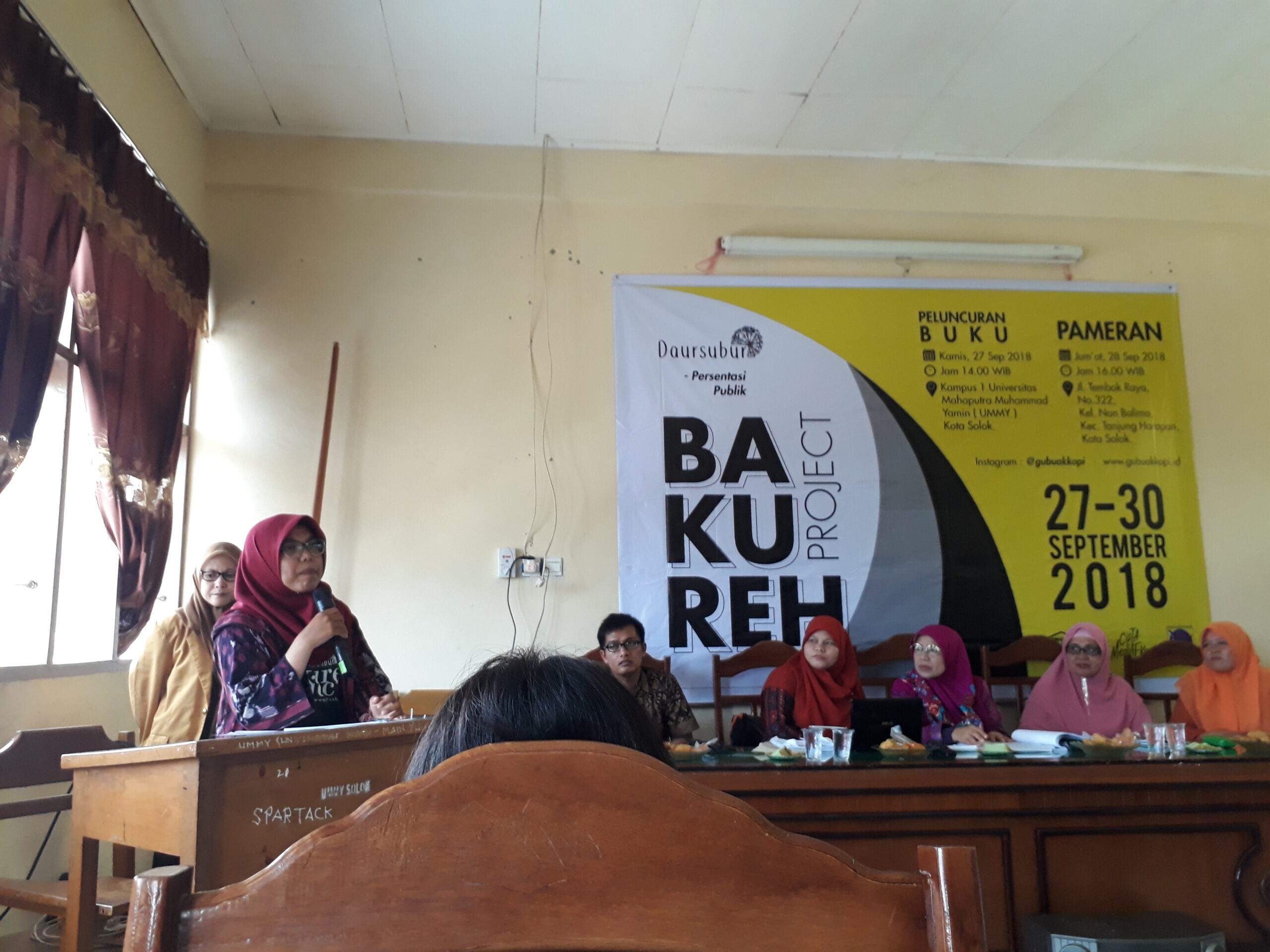 Pada 27 September hingga 4 Oktober 2018 lalu, telah diselenggarakan kegiatan presentasi publik Bakureh Project. Kegiatan prsentasi ini terdiri dari peluncuran buku dan pameran. Kegiatan peluncuran buku diselenggarakan tepatnya pada 27 September 2018 di Kampus I UMMY Kota Solok, dengan menghadirkan Dr. Irfani Basri, M. Pd (Dosen FBS UNP) dan Zulfikarni, S. Pd (Dosen UNP/Peneliti Sastra Minangkabau) selaku pembahas, Dimoderatori oleh Dr. Zona Ridarahayu, M.Pd (Dosen UMMY Solok). Pada 28 September kegiatan dilanjutkan dengan pembukaan pameran yang juga terdiri dari rangkaian pertunjukan.
