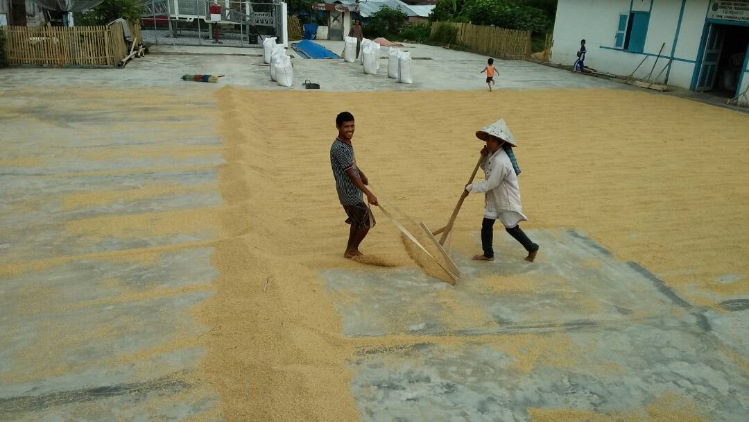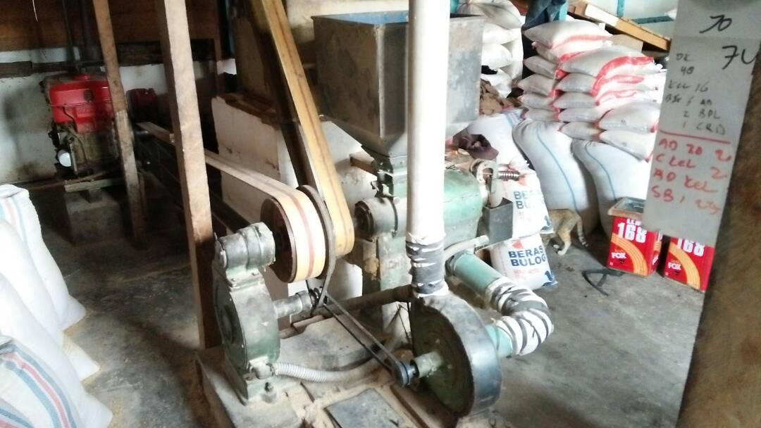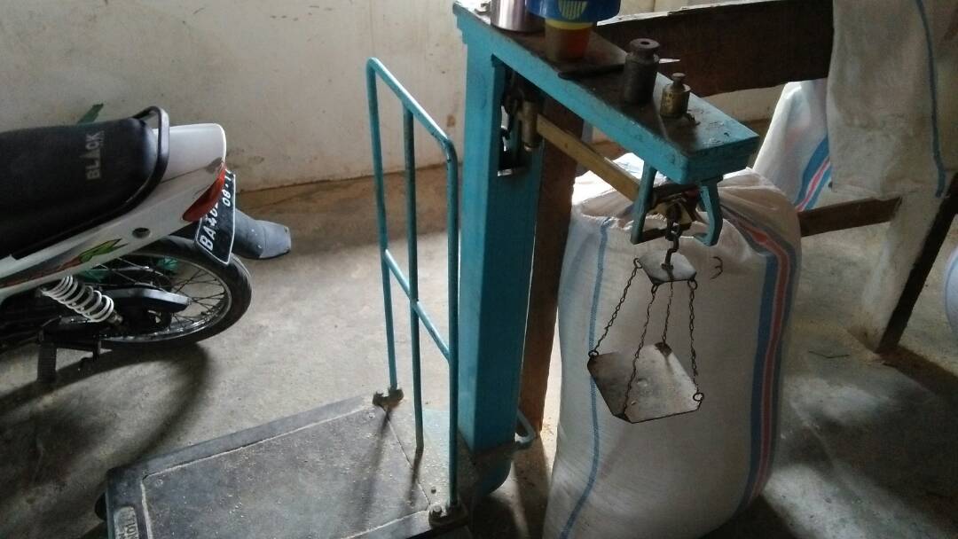 Setelah padi terkumpul, padi disalin menggunakan sekop yang terbuat dari besi ke dalam karung. Setelah karung penuh, karung diangkat menggunakan gerobak dan didorong menuju gudang heler. Beruntung hari itu kami diizinkan untuk mengambil beberapa gambar, kami pun menuju ke dalam bangunan heler, melihat dan medokumentasikan suasana di dalam bangunan. Di dalam bangunan, terlihat karung-karung padi yang telah terisi tersusun rapi, juga terdapat mesin penggiling padi, dan juga timbangan. Saat itu mesin penggiling padi sedang tidak bekerja, jadi saya belum dapat melihat langsung proses pemisahan/pengupasan padi dari sakam.