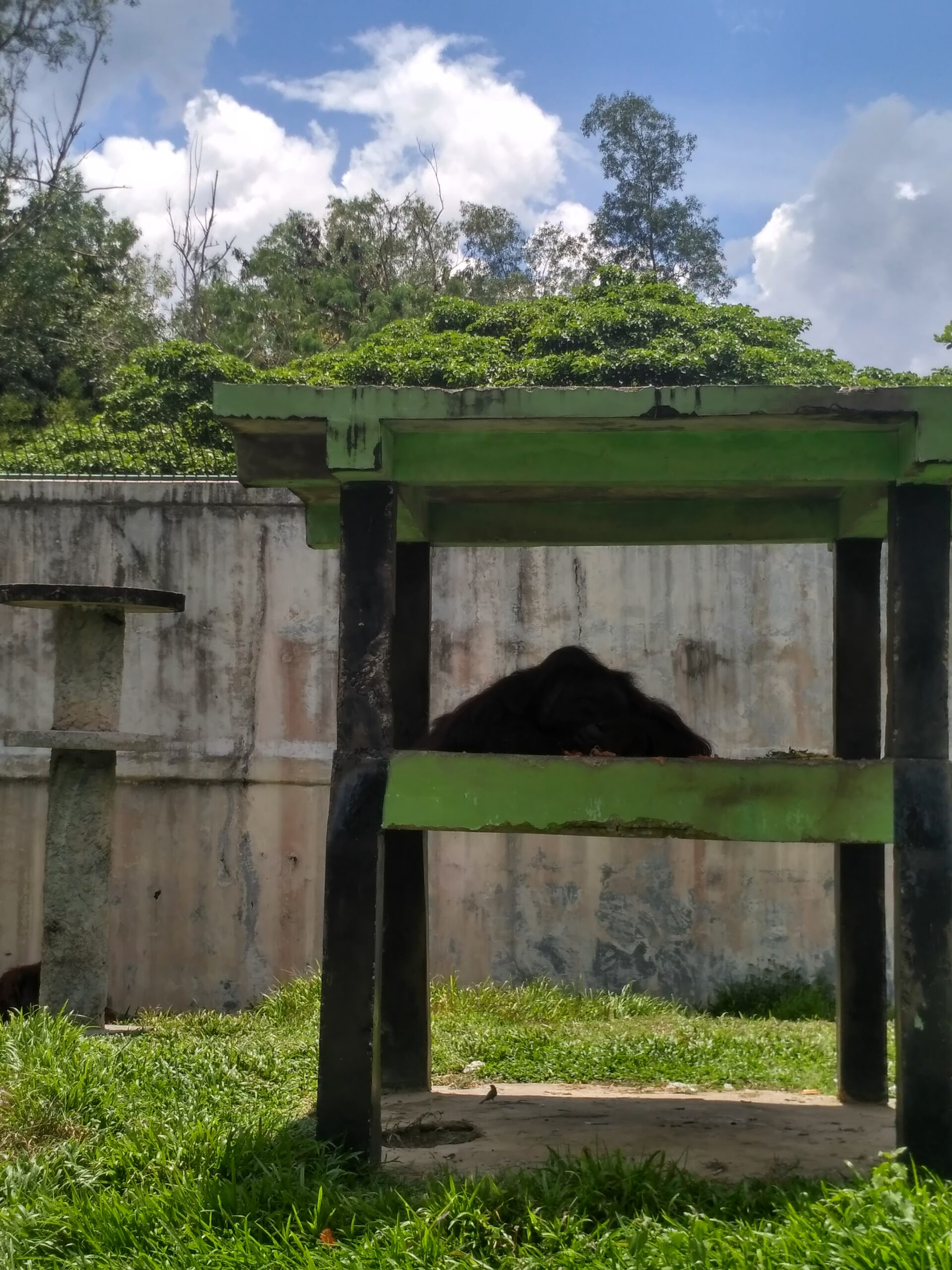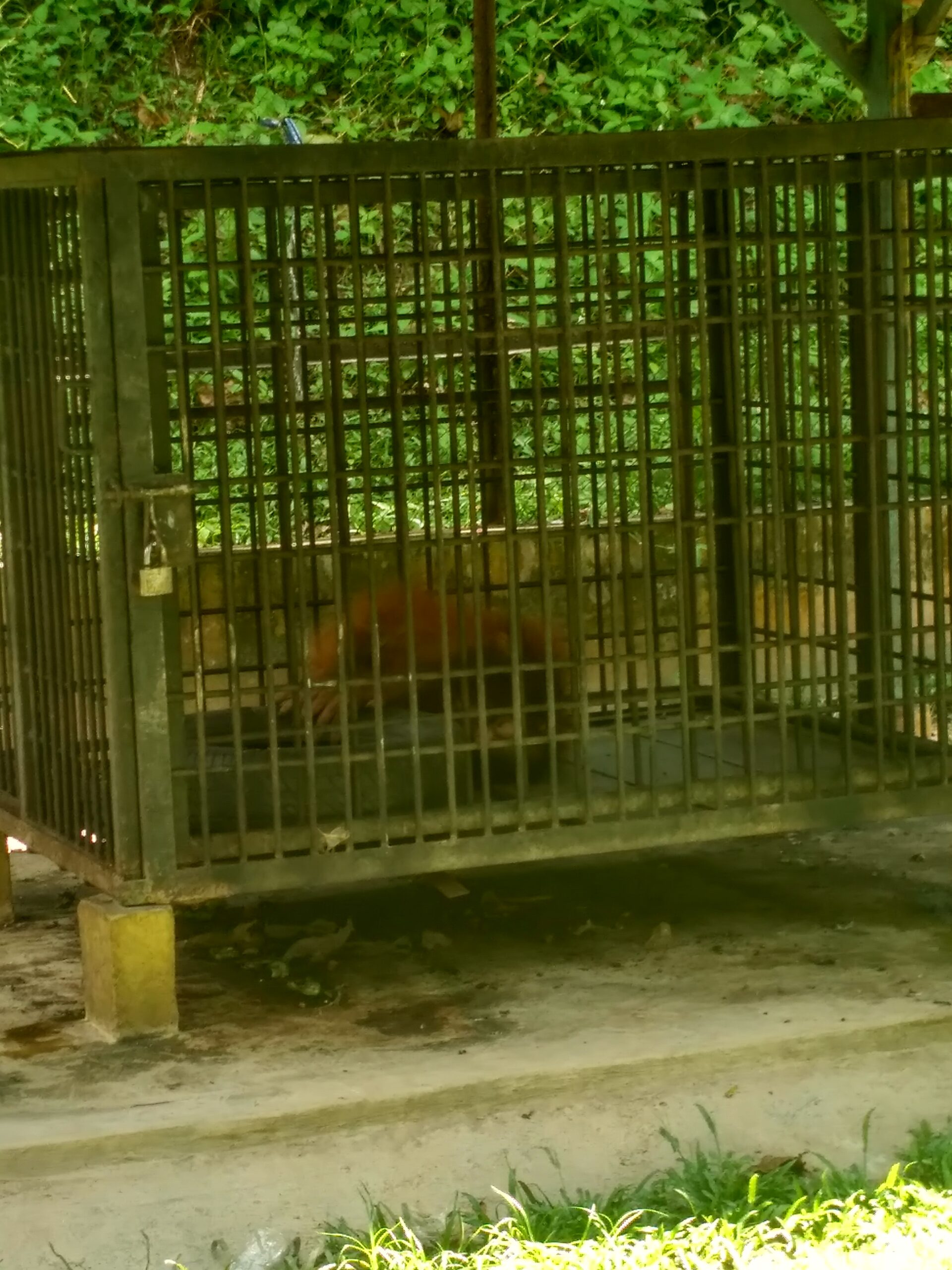 Saya mencoba menyapa orangutan dewasa itu, tetapi tidak ada respon, dia hanya berbaring dengan posisi menelungkup dibangunan yang memiliki atap, mungkin karena cuaca yang sangat panas membuat orangutan itu menjadi malas untuk bergerak. Lalu saya mencoba mengelilingi kandang orangutan itu, di saat saya beraa di batas kandang orangutan dengan kandang yang ada di sebelahnya, saya kaget ternyata ada satu lagi orangutan yang berlindung di bawah bayangan dinding yang ukuranya lebih kecil sedikit dari ukuran orangutan yang satunya mungkin 2 kali ukuran manusia dewasa. Di saat mencoba menyapa orangutan yang lebih kecil, orangutan yang satunya mulai melakukan pergerakan dengan turun dari bangunan yang memiliki atap dan menuju kearah orangutan yang lebih kecil itu, di tengah jalan menuju orangutan yang lebih kecil itu ada sebuah tiang yang terbuat dari beton, orangutan yang lebih besar itu menggoyangkan tiang itu dengan mudahnya, seakan ingin memberikan saya peringatan untuk tidak mendekat ataupun mengganggu mereka, hal itu membuat saya terkejut dan membayangkan begitu luar biasanya kekuatan orangutan yang besar itu.